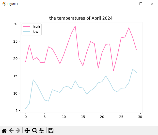 low.append(float(row[-3])) # ์ต์ ๊ธฐ์จ ๋ฐ์ดํฐ๋ row[-3]์ ์์น