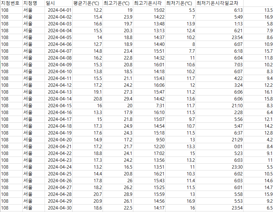 ๊ณต๊ณต๋ฐ์ดํฐ์ธ 2024๋ 4์ ๊ธฐ์จ ๋ฐ์ดํฐ ์ค ์ต์ ๊ธฐ์จ๊ณผ ์ต๊ณ ๊ธฐ์จ์ ์ถ์ถํด ์๊ฐํํ๋ค.